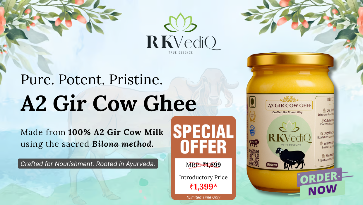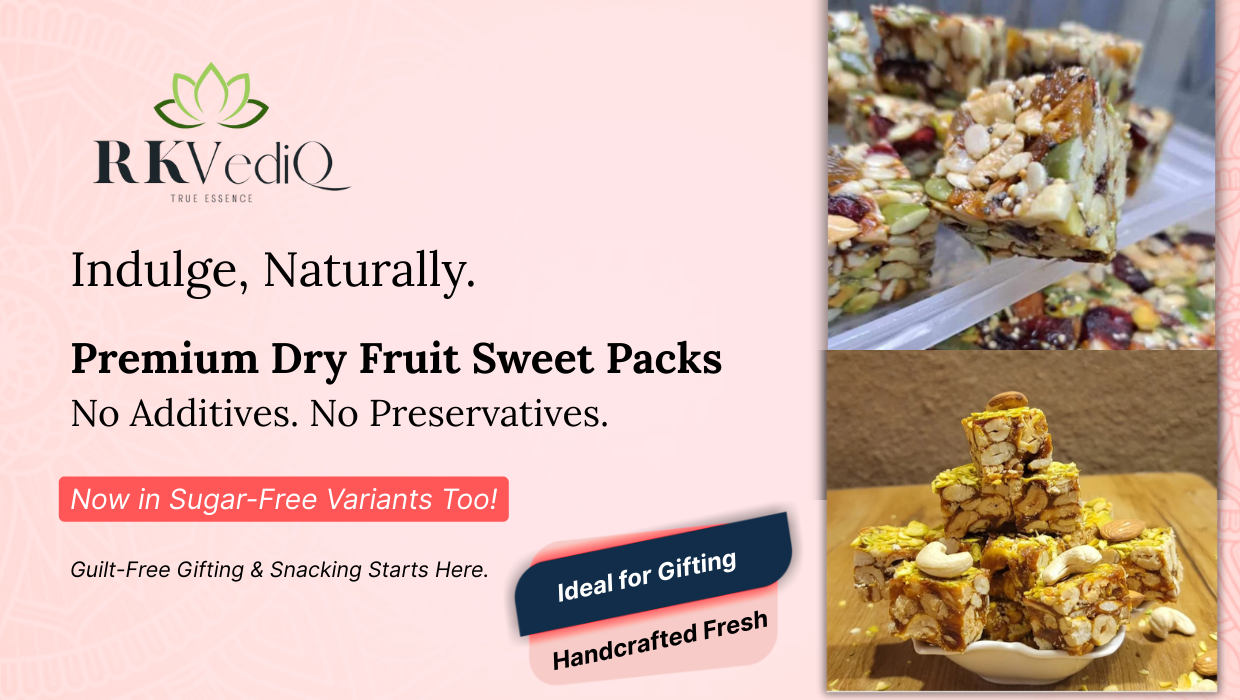 We craft our products with utmost care, using the finest natural ingredients and time-tested methods like the Bilona process for our A2 Gir Cow Ghee. From nutrient-rich dry fruit mixes to sugar-free sweets, every RKVediQ product is designed to nurture your health without compromising on taste.